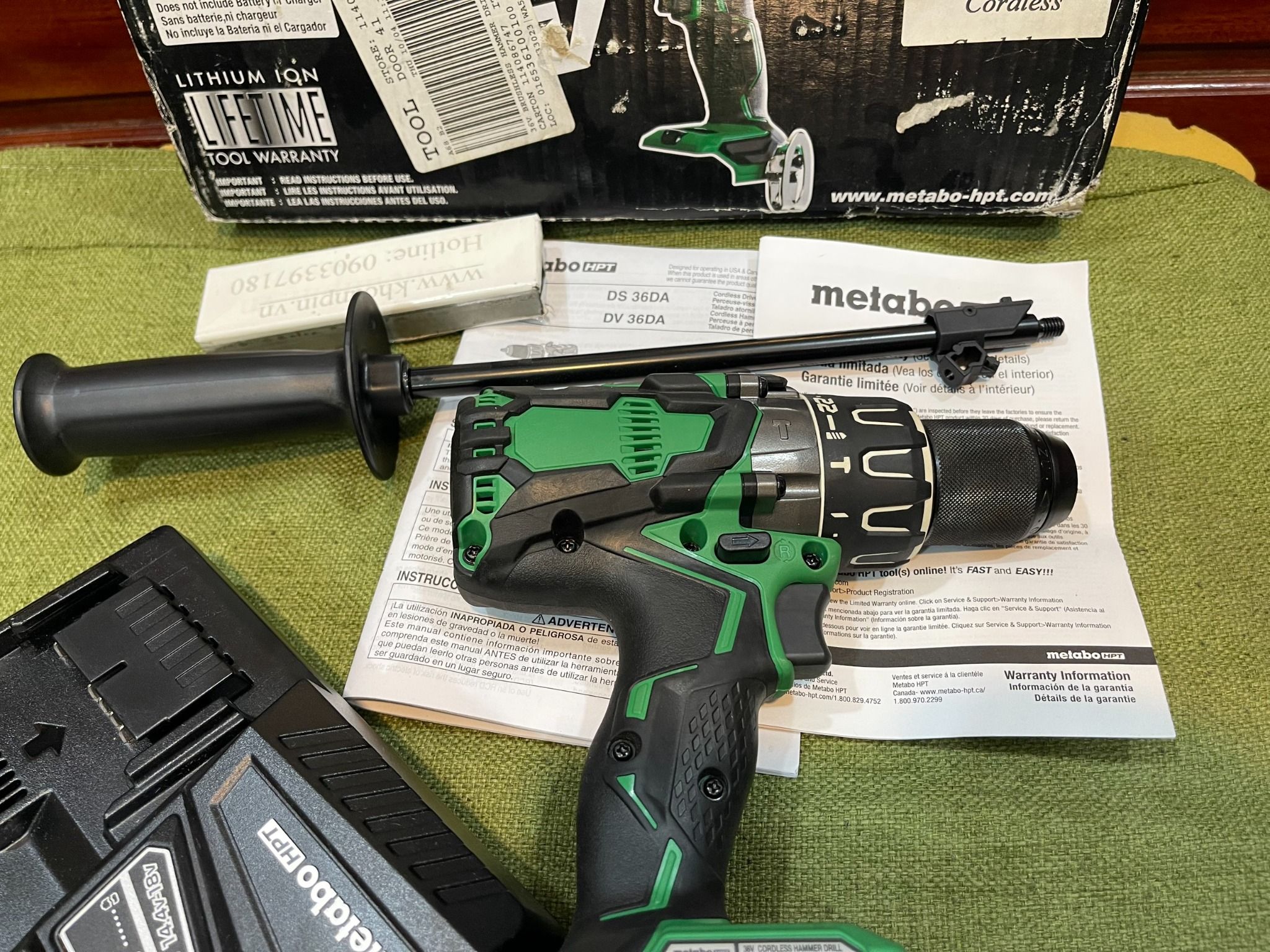 - Bao gồm: máy khoan búa, (2) pin 36V, bộ sạc nhanh với USB, tay cầm bên, mũi khoan Phillips số 2 và hộp đựng